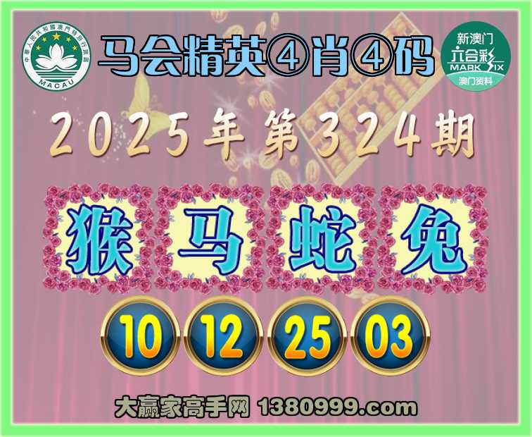 324期:【马会精英】 🥼④肖④码🥼【猴马蛇兔】【10.12.25.03】开:兔15准