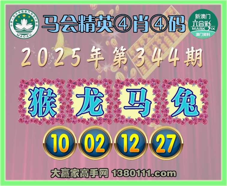 344期:【马会精英】 🥼④肖④码🥼【猴龙马兔】【10.02.12.27】开:兔27准
