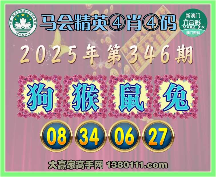 346期:【马会精英】 🥼④肖④码🥼【狗猴鼠兔】【08.34.06.27】开:兔03准