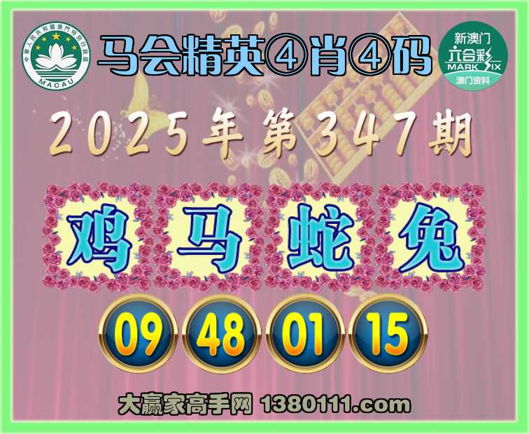 347期:【马会精英】 🥼④肖④码🥼【鸡马蛇兔】【09.48.01.15】开:蛇13准