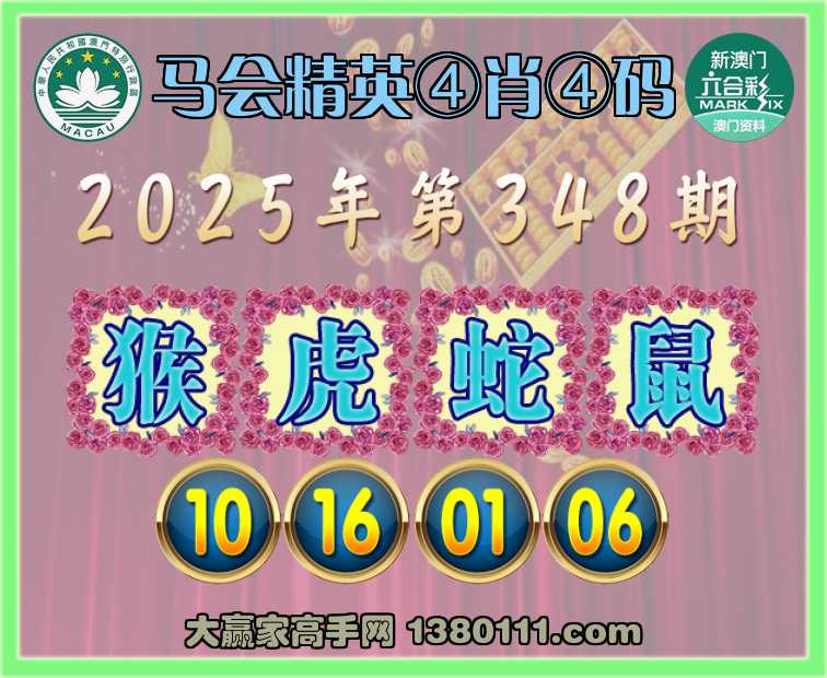 348期:【马会精英】 🥼④肖④码🥼【猴虎蛇鼠】【10.16.01.06】开:虎16准