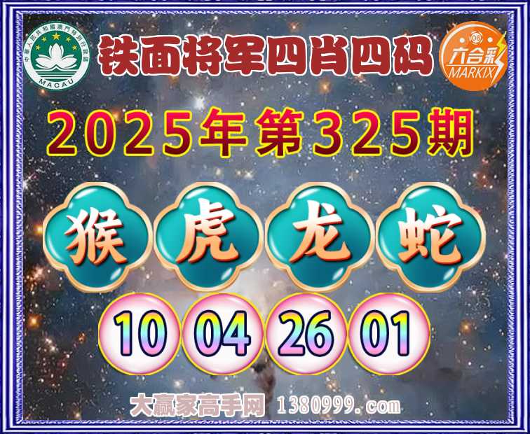 325期: 铁面将军 🍖四肖四码🍖【猴虎龙蛇】【10.04.26.01】开:虎04准