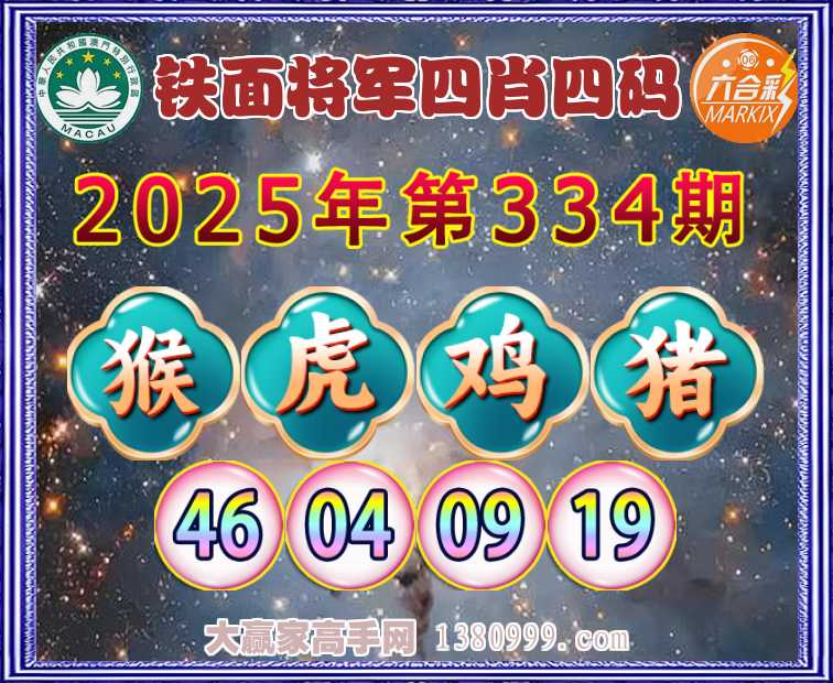 334期: 铁面将军 🍖四肖四码🍖【猴虎鸡猪】【46.04.09.19】开:猴46准