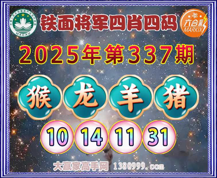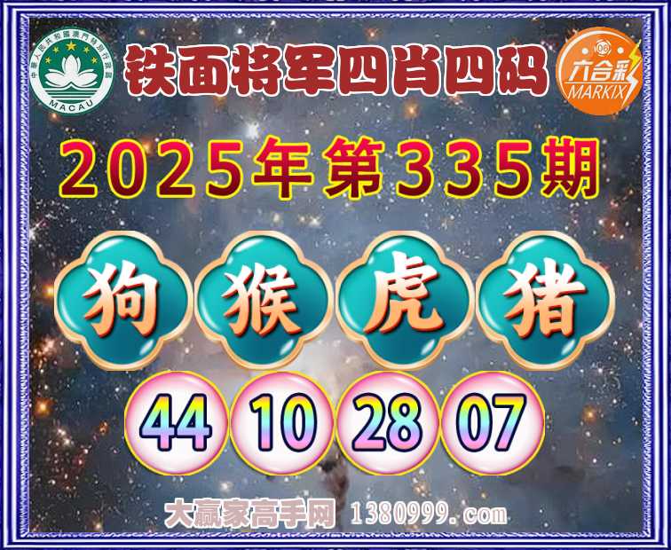 335期: 铁面将军 🍖四肖四码🍖【狗猴虎猪】【44.10.28.07】开:狗44准